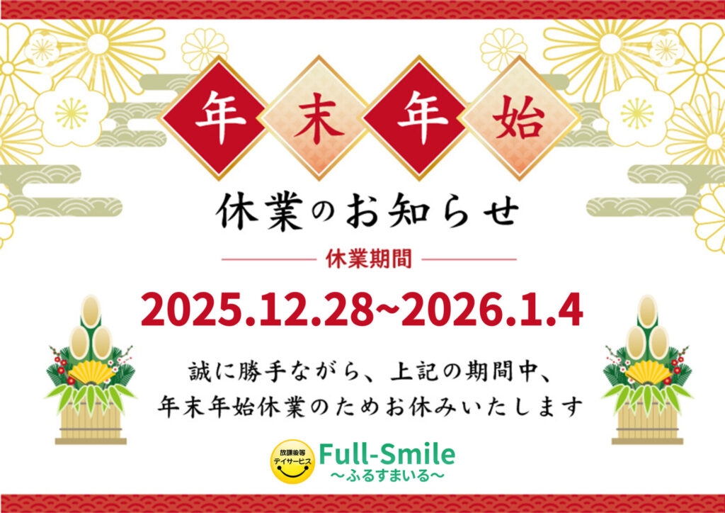 誠に勝手ながら、2025年12月28日(日)~2026年1月4日(日)まで、「株式会社わかな(放課後等デイサービス Full-Smile ふるすまいる)」は年末年始休業とさせていただきます。