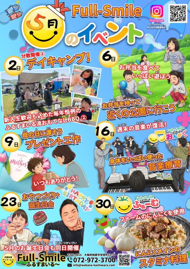 令和8年5月の予定表を更新しました! 2026年4月3日 最終更新日時 : 2026年4月3日 full-smile 郵送にて保護者様にお送り致します、2026年5月の予定表を先にアップロード致しました。 また、活動カレンダーでも随時ご確認は可能ですので、合わせてどうぞご活用下さい。 イベント別紙2026.5月ダウンロード 2026年5月予定表ダウンロード